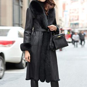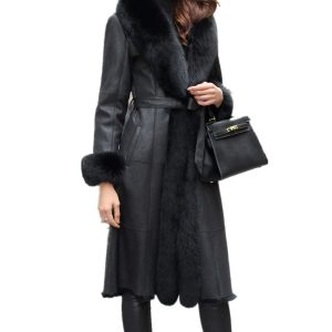 Step out in style with this long black coat, elegantly trimmed with plush fur along the collar, front, and cuffs. The tailored fit and self-tie belt create a flattering ...