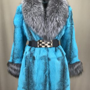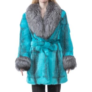 Brighten up your winter wardrobe with this striking turquoise fur coat, beautifully accented by a plush silver raccoon fur collar and cuffs. The rich color and contrasting textures create ...