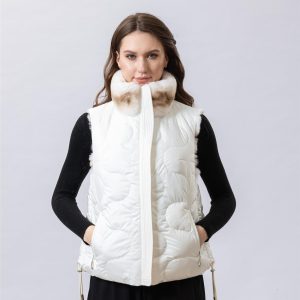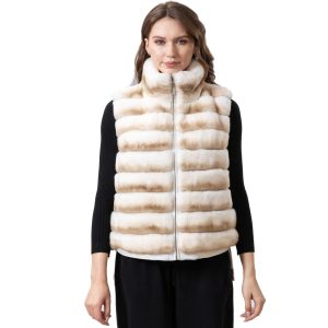 Add a modern and elegant touch to your winter attire with this chic striped fur vest. Featuring horizontal bands of soft cream and beige tones, this piece exudes both ...