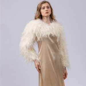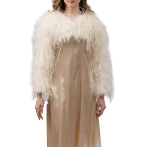 This elegant ivory feathered shawl is the perfect finishing touch for any special occasion. With its delicate, airy texture and luxurious volume, it creates a dramatic and graceful silhouette. ...