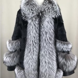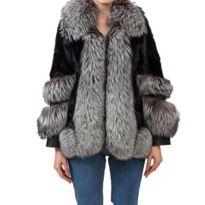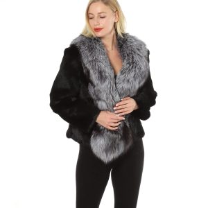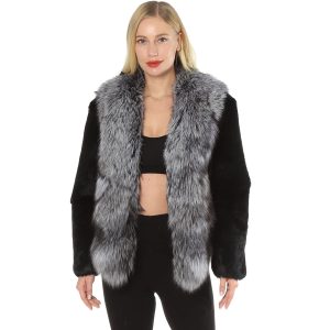 Elevate your cold-weather style with this striking contrast fur jacket. The design features a dramatic blend of textures: a lush, silvery fur front panel paired with sleek black sleeves ...