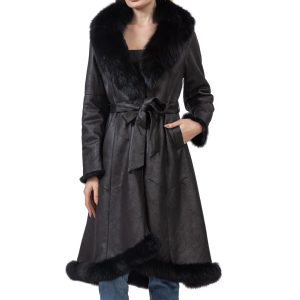 Step out in timeless elegance with this stunning black belted coat, featuring a luxurious fur collar that exudes sophistication and warmth. The sleek silhouette is complemented by a self-tie ...